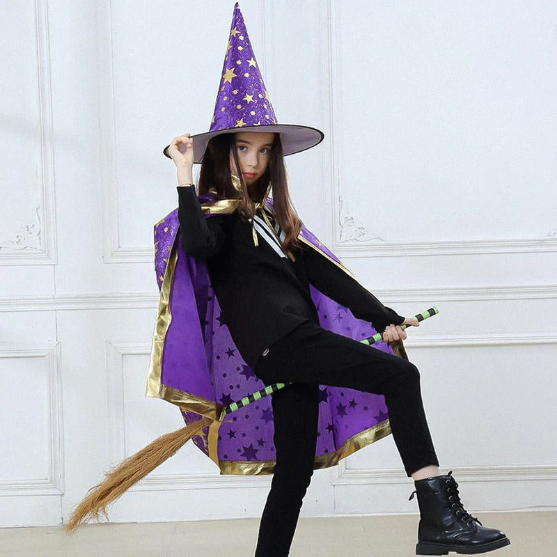 Les étoiles dorées scintillent à chaque mouvement, créant un effet visuel captivant. Une cape qui attire tous les regards, parfaite pour Halloween ou toute fête costumée.