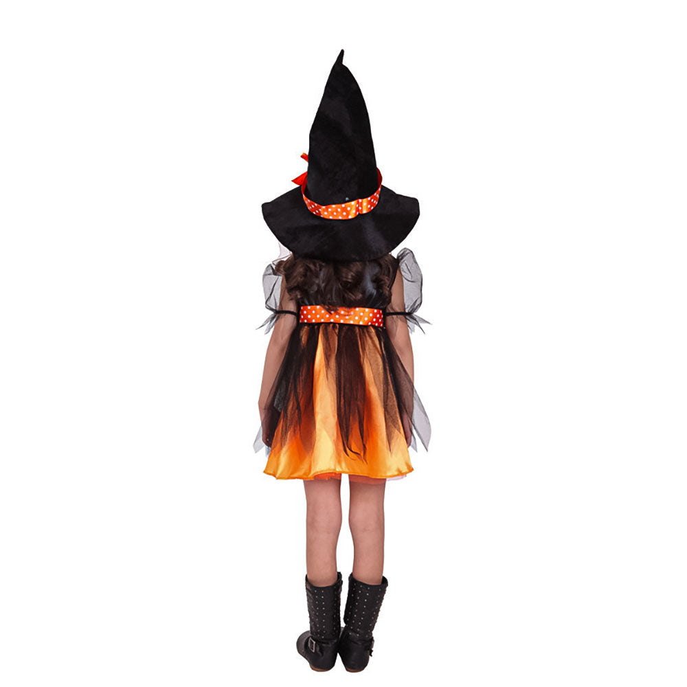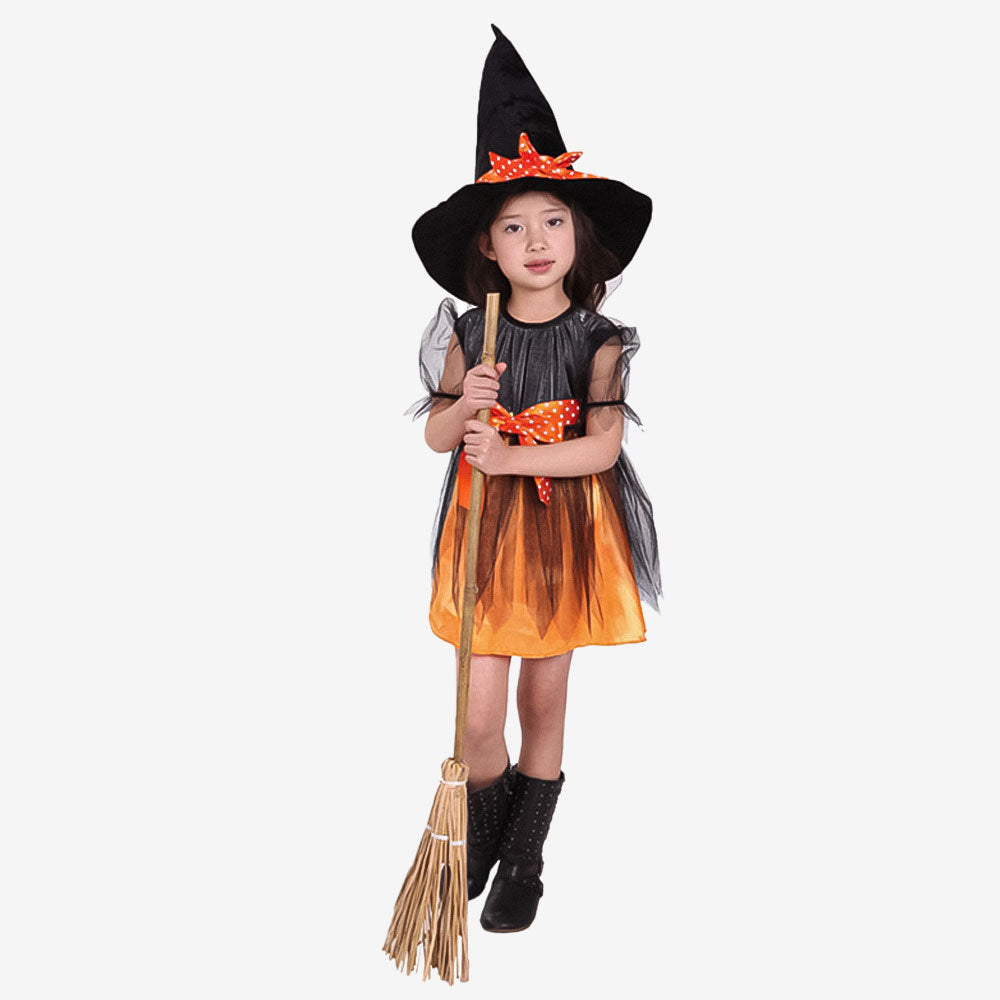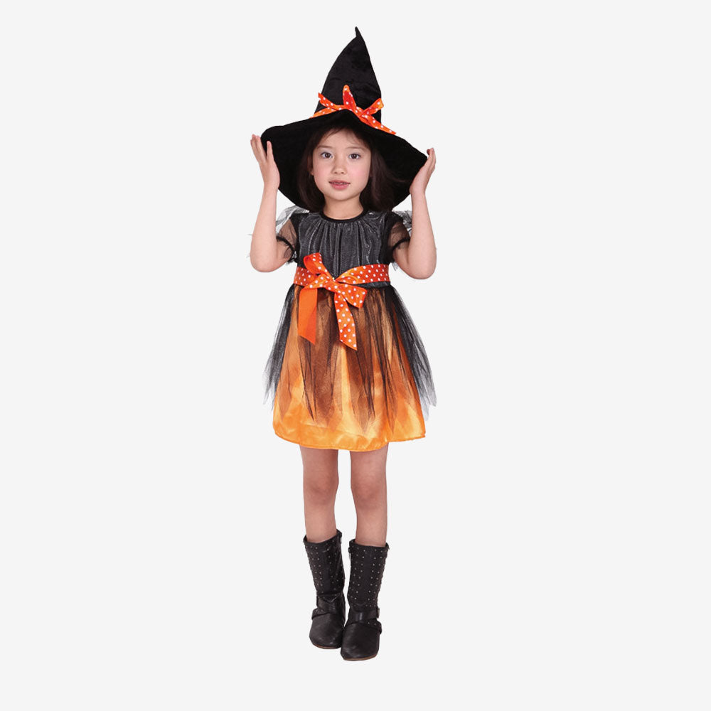Avec sa jupe orange éclatante et ses détails noirs vaporeux, ce costume évoque la magie et la fête d’Halloween dans toute sa splendeur. Le ruban à pois apporte une touche espiègle et adorable.