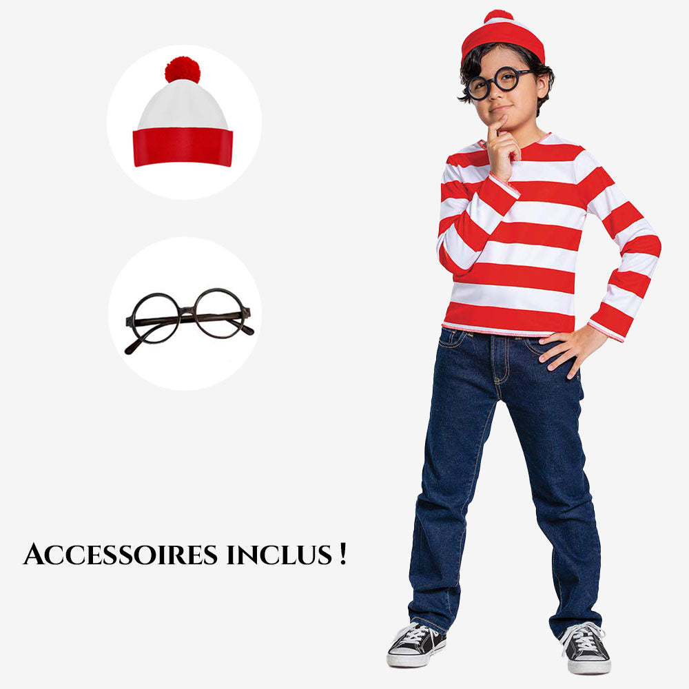 Impossible de passer inaperçu avec ce haut rayé rouge et blanc. Dès qu’il apparaît, les sourires se dessinent. C’est le déguisement parfait pour jouer, défiler ou simplement s’amuser à être « celui qu’on cherche ».