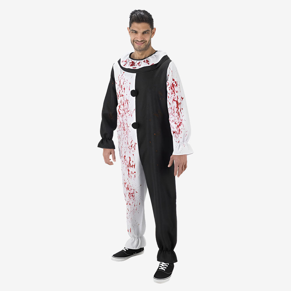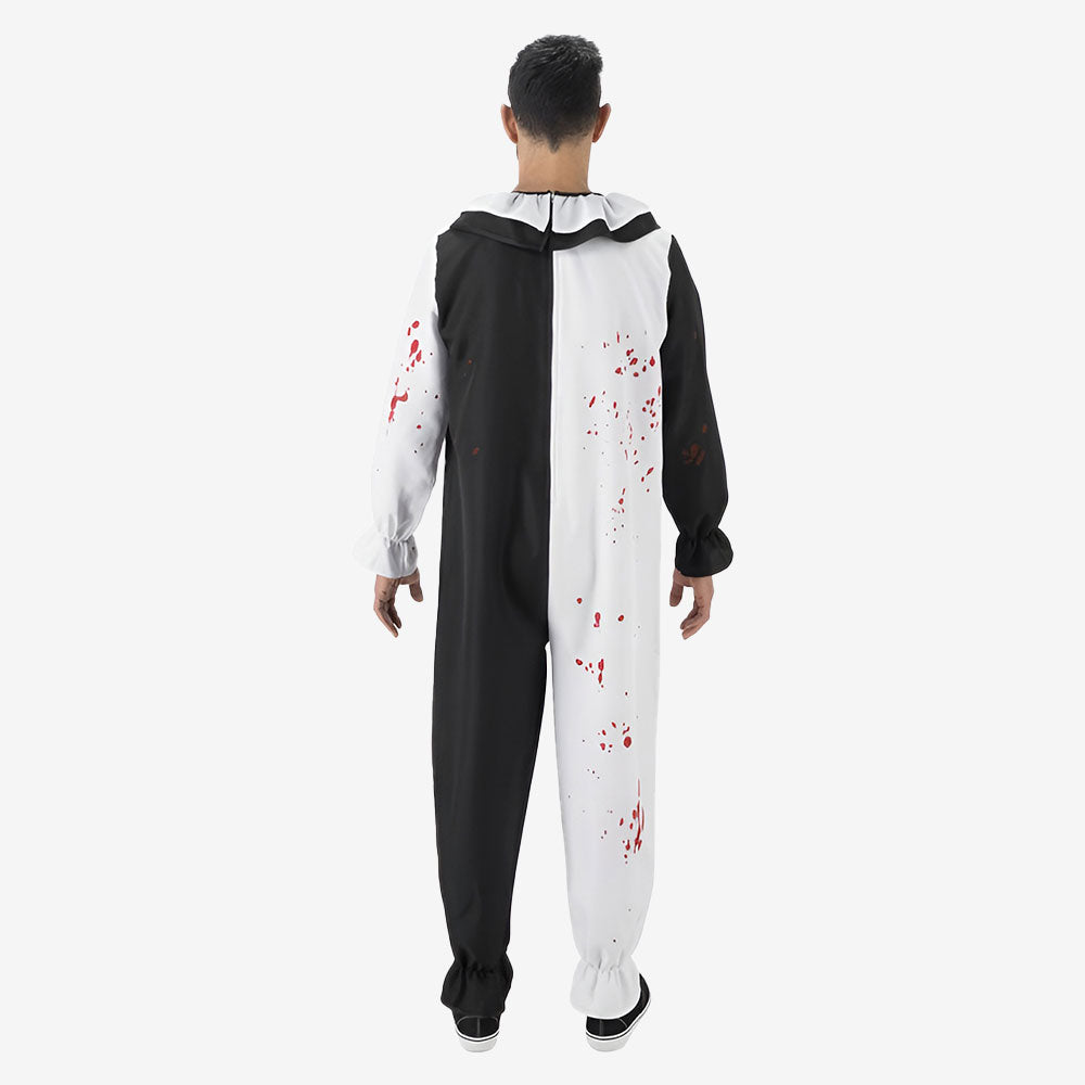 La combinaison bicolore maculée d’éclaboussures rouges crée un effet visuel puissant. Le contraste du noir et du blanc accentue chaque mouvement, pour un rendu terrifiant et réaliste à la lumière des fêtes d’Halloween.
