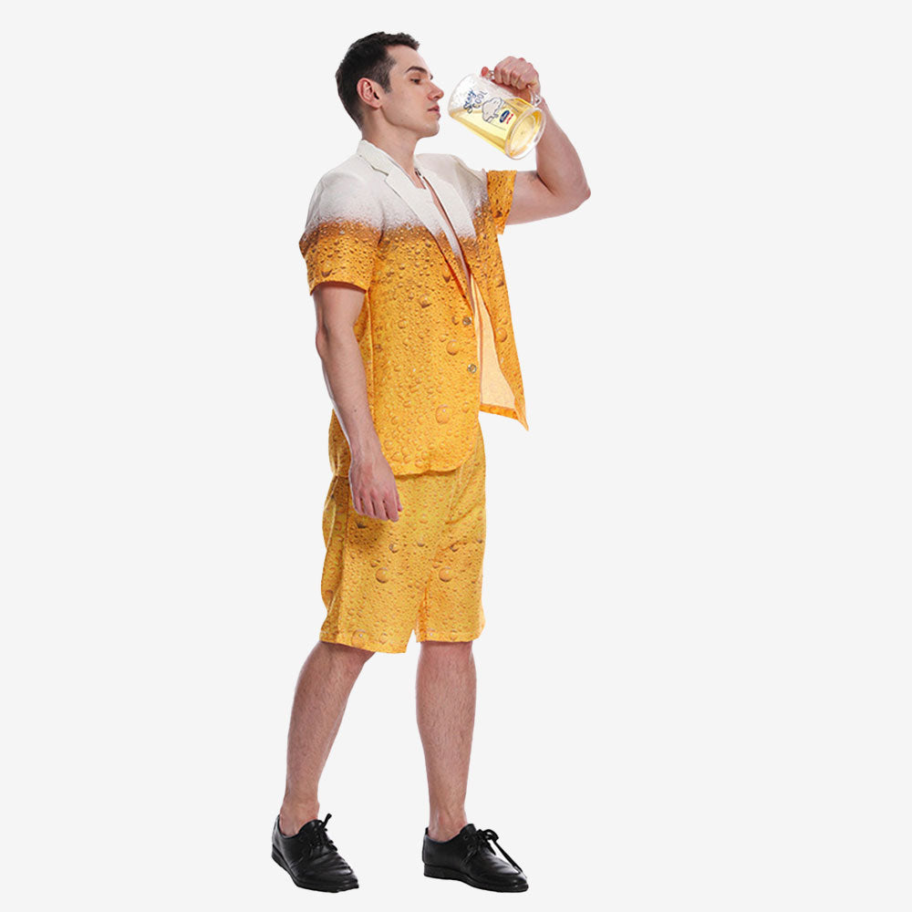 Version short : veste imprimée “bière”, short assorti, cravate.