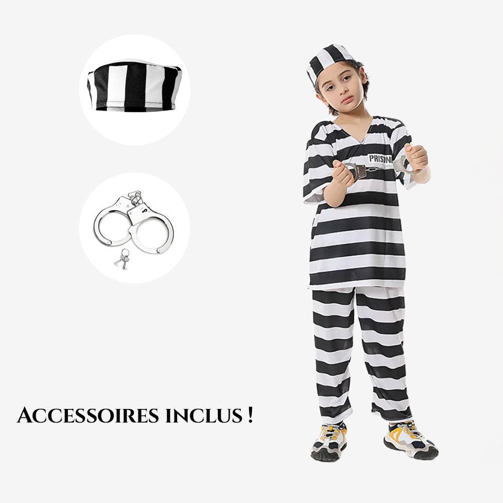 Version rayée : haut à rayures noires et blanches, pantalon assorti, coiffe rayée, menottes.
